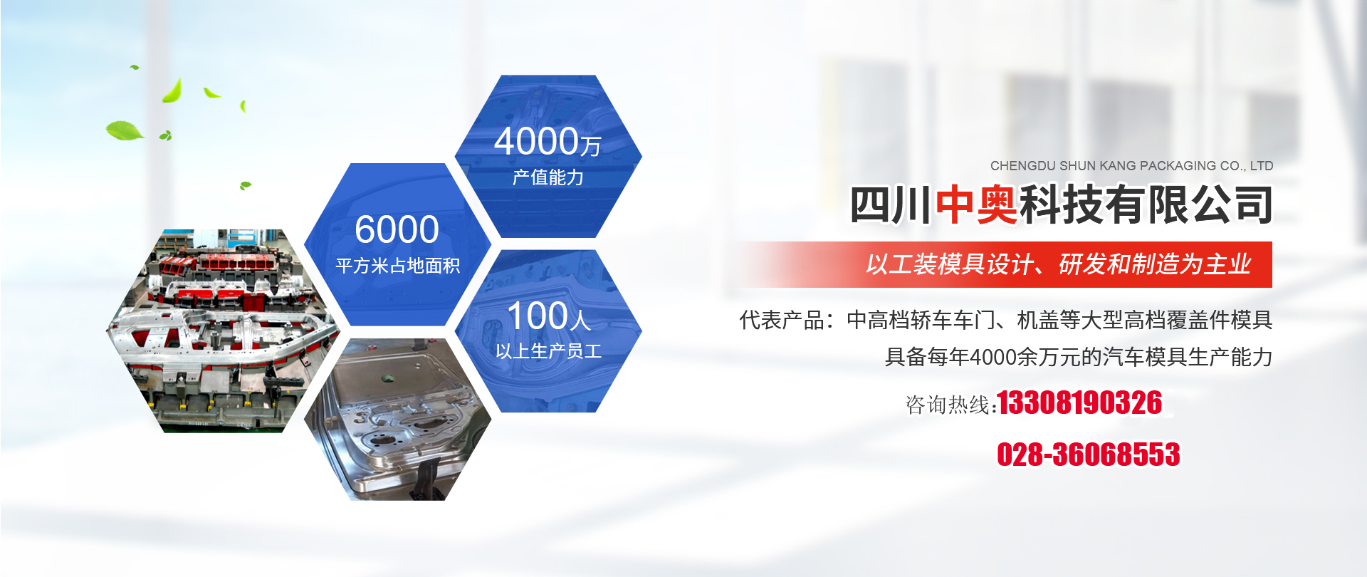 四川中奧科技有限公司位于四川天府新區視高經濟開發區,廠房占地面積約6000平方米,員工100余名。系原成都奧和海科技發展有限公司發展而成,公司依靠于為大型汽車模具廠商(成飛集成、天津麥格納、柳州廣菱汽車、柳州福臻、東風二汽、長安汽車模具車間等)提供設計、數控加工、調試等環節服務發展多年至今,形成以工裝模具設計、研發和制造為主業,代表性產品是中高檔轎車的機蓋、車門內板等大型、高檔次的覆蓋件模具,具備每年5000余萬元的汽車模具生產能力和3000余萬元的冷沖壓件生產能力。